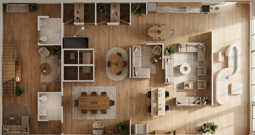 My portfolio showcases commercial interior spaces designed to balance functionality with the warmth and comfort typically found in residential environments. Each project focuses on creating welcoming, human-centered spaces that support productivity while maintaining an inviting and relaxed atmosphere.